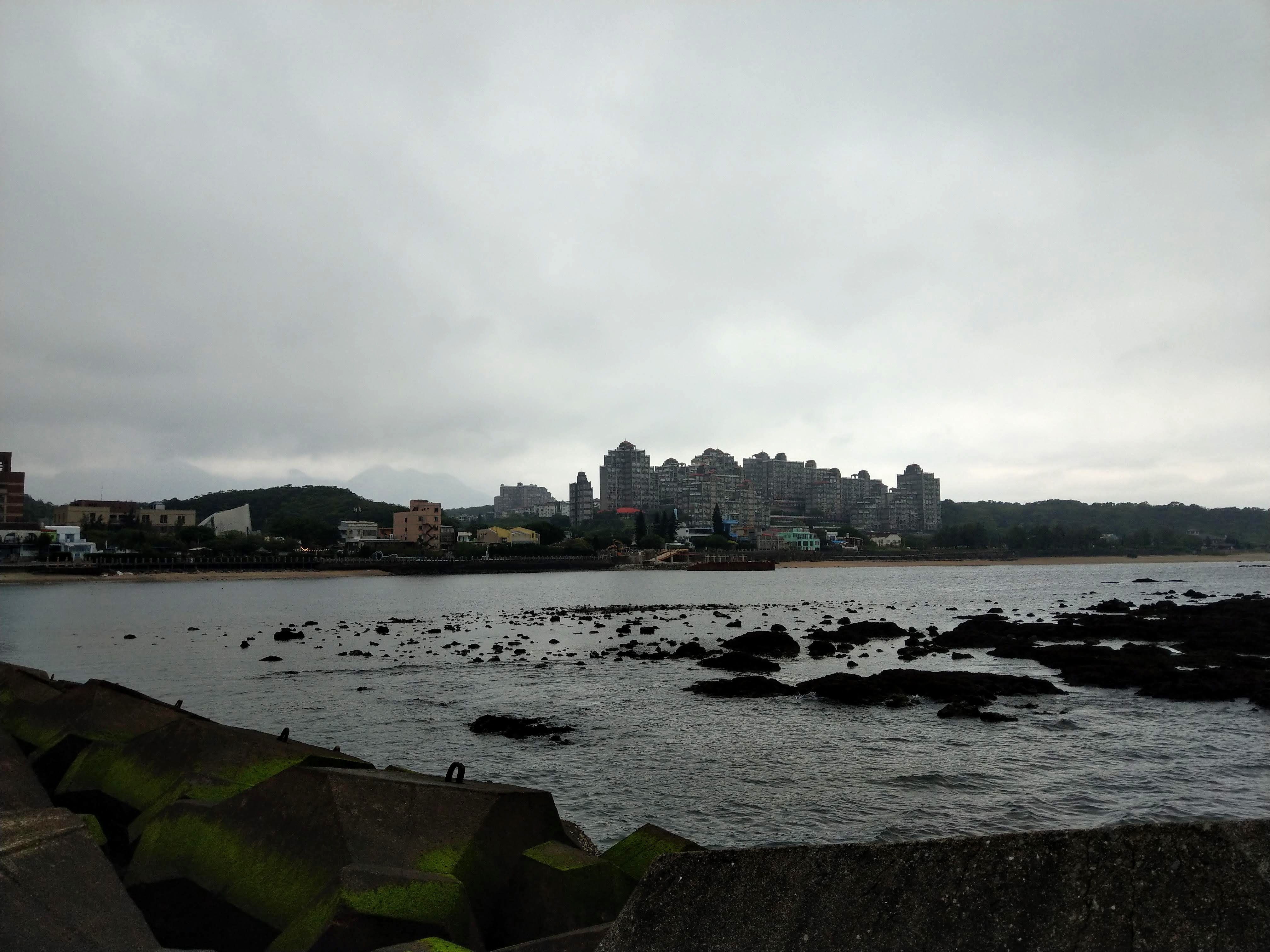 往右邊沿著沙灘走就是後厝漁港,港的左側有一排向外延伸的肉粽。滿潮時間已過,可以看到水中礁石隨著水位降低逐漸露出。